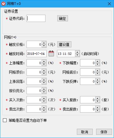 1 请首先输入6位证券代码,确定之后显示股票信息;2 进行详细参数设置,或点击建议值轻便设置。 触发价格:代表策略的起始价格,默认为昨日收盘价;当触发成交后(买入或卖出成交),触发价格将上移或下移;如需修改,请在盘中自行修改更新。触发时间:策略开始执行的时间,也即达到预定时间之后,策略才开始执行(主界面上状态栏绿色为策略未触发,红色表示策略正在执行中)。 上涨幅度、下跌幅度:每个网格的上涨或下跌幅度(上、下网格可以不同),点击建议值按钮后程序根据每个股票价格自动进行计算出默认幅度。 回落反弹:股票冲高后价格下跌的幅度,程序可根据每个股票价格自动进行计算出默认参数比(±%)。 网格顶价:默认为0,如设置网格顶价后,则价格到达设置顶价,止盈卖出清仓。 网格底价:默认为0,如设置网格底价后,则价格到达设置底价,止损卖出清仓。 报价优化:成交价格±%比(买入时高于当前价,卖出时低于当前价)。 买入次数、卖出次数:限制发出交易指令的次数,当买入次数限制达到自触发时间以来的总买入次数时,不发出买入指令;卖出次数同理。 买入股数、卖出股数:每次买入或卖出的股票数量。
