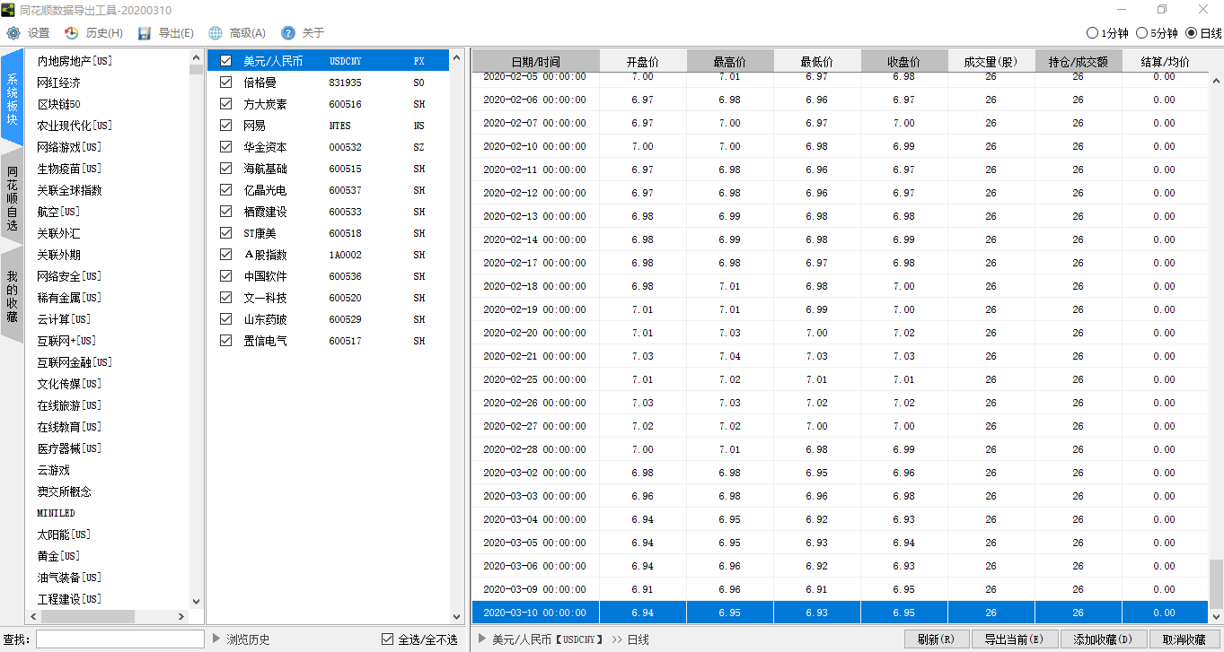 应股友要求,将文华财经数据导出工具修改为同花顺数据导出,实现对同花顺的历史数据一键查看和批量格式化导出,解决股友们其它分析软件的数据问题。特点:导出的字段、格式、顺序可以自定义,从而根据不同的格式需要进行导出。
