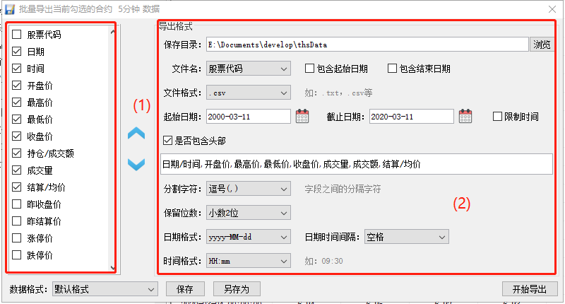 - 可设置的格式有:导出的文件名、数据的起止日期、是否包含头部、各字段间的分割符、日期/时间格式等;