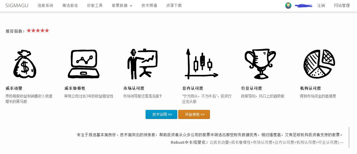 网站特点:1)基本面+技术面选股:专注于挑选基本面良好、技术面突出的领涨股,帮助投资者从众多公司的股票中筛选出那些财务数据优秀,相对强度高,又有足够机构投资者支持的股票; 2)提供丰富的股市教学资源,以及行情数据和分析报告;3)股票软件的开发。