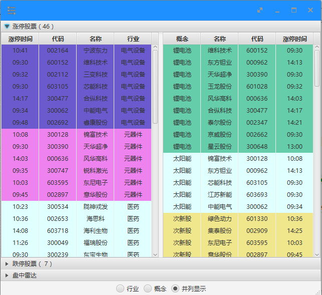 软件特色:颜色分类区别显示各行业的涨跌停股票数据(考虑了属于多个行业的股票),实时展示某个行业的涨跌停股票与时间,同时盘后统计涨跌停股票数量并本地保存。