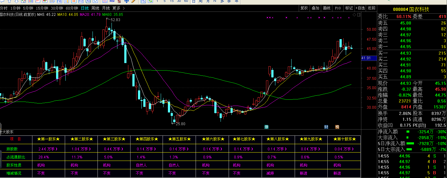 十大流通股股东在流通股中的比例是一个值得关注的问题,许多上市公司十大流通股股东占据了流通股的大多数,而这十大股东虽然是流通股,但基本也很少变化,公式在通达信幅图中显示持股数、占流通股比例、股东性质等数据。