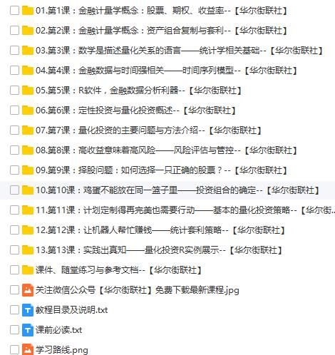 金融量化交易系列课程,包含了理论基础+编程基础+编程实战+能力提升等,提供了完善的辅助学习资料和完整学习体系,拓宽知识面和提升自己,涵盖了大数据环境下的金融分析,Python语言的金融分析扩展包的使用,还有量化的实战项目演练等等。