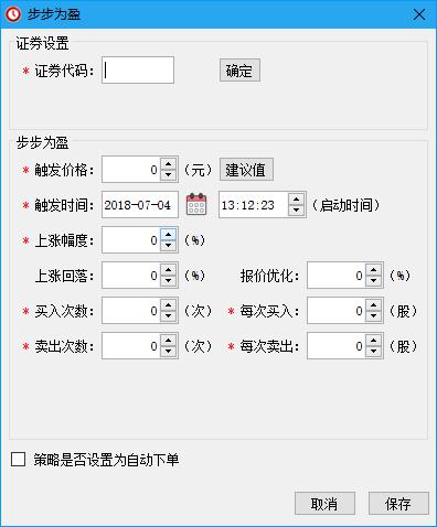 1 请首先输入6位证券代码,确定之后显示股票信息;2 进行详细参数设置,或点击建议值轻便设置。 触发价格:代表策略的起始价格,默认为昨日收盘价;当触发成交后(买入或卖出成交),触发价格将上移或下移;如需修改,请在盘中自行修改更新。触发时间:策略开始执行的时间,也即达到预定时间之后,策略才开始执行(主界面上状态栏绿色为策略未触发,红色表示策略正在执行中)。 上涨幅度、下跌幅度:每个网格的上涨或下跌幅度(上、下网格可以不同),点击建议值按钮后程序根据每个股票价格自动进行计算出默认幅度。 回落反弹:股票冲高后价格下跌的幅度,程序可根据每个股票价格自动进行计算出默认参数比(±%)。 网格顶价:默认为0,如设置网格顶价后,则价格到达设置顶价,止盈卖出清仓。 网格底价:默认为0,如设置网格底价后,则价格到达设置底价,止损卖出清仓。 报价优化:成交价格±%比(买入时高于当前价,卖出时低于当前价)。 买入次数、卖出次数:限制发出交易指令的次数,当买入次数限制达到自触发时间以来的总买入次数时,不发出买入指令;卖出次数同理。 买入股数、卖出股数:每次买入或卖出的股票数量。